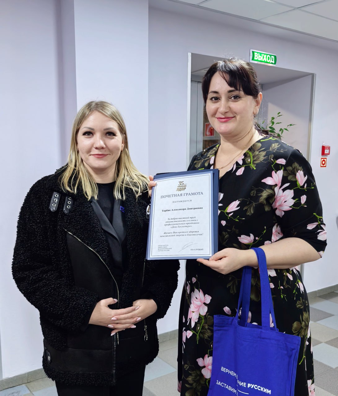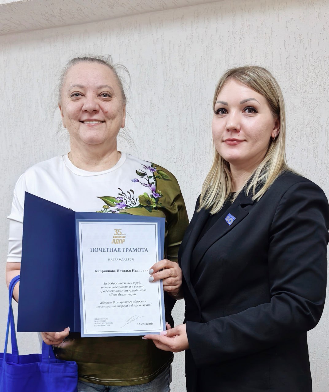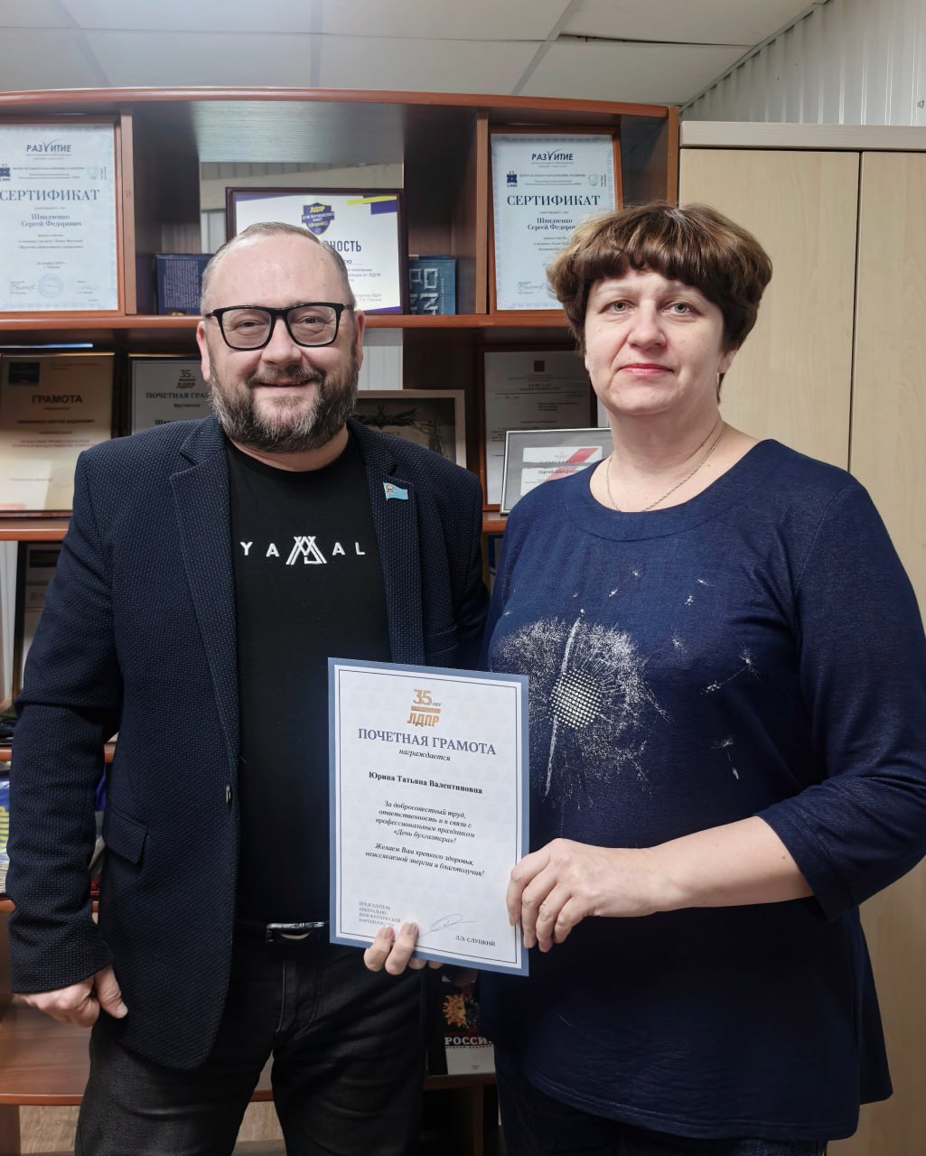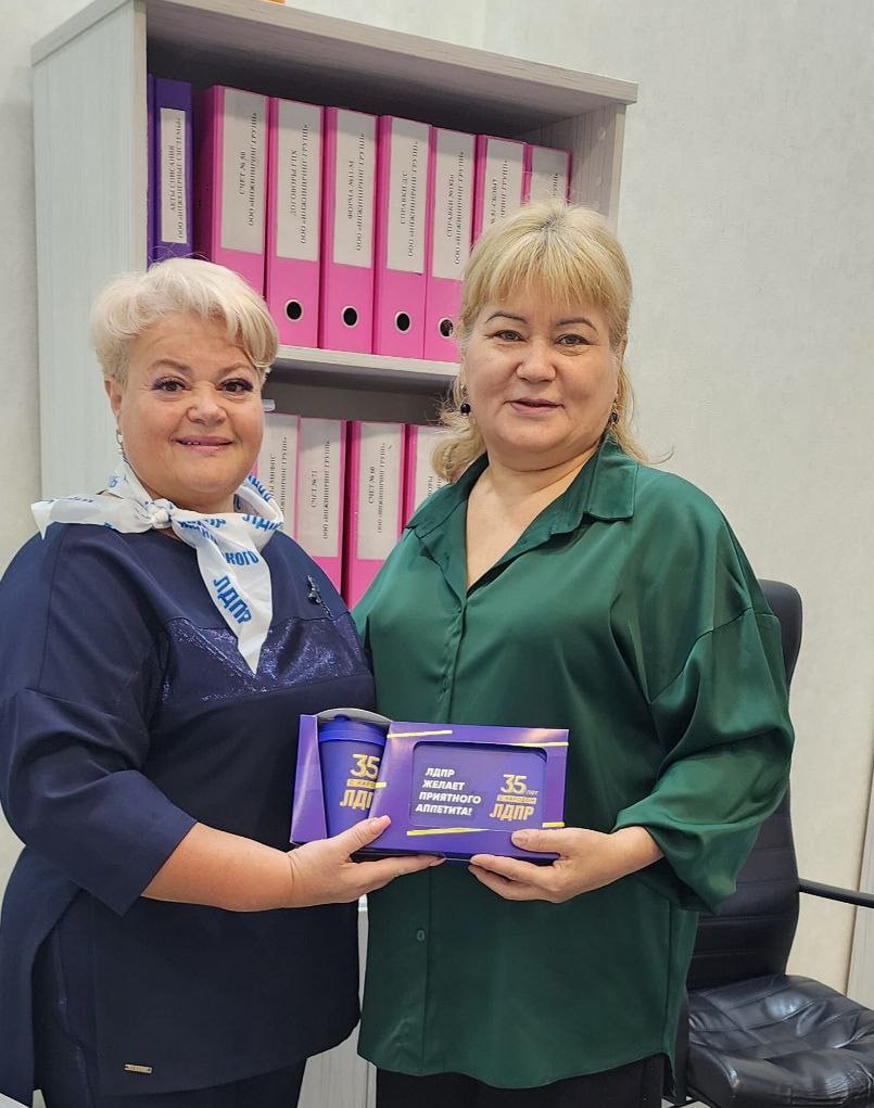 В Ноябрьске депутат Городской Думы Сергей Швидченко и помощник депутата Законодательного Собрания ЯНАО Андрея Кузнецова Алевтина Комарова передали бухгалтерам города подарки и Почетную грамоту от Председателя ЛДПР Леонида Слуцкого.