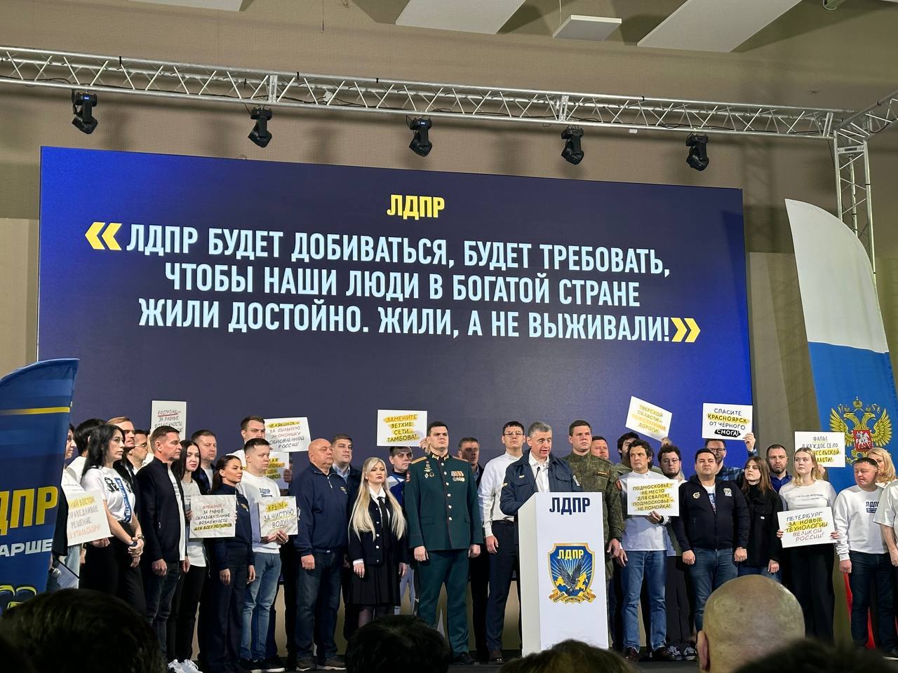 На слете ЛДПР выступил председатель партии Леонид Слуцкий. Он заявил: «ЛДПР всегда отличалась и, обещаю вам, будет отличаться от своих политических партнёров. Мы смотрим на жизнь глазами нашего избирателя — человека, чьи жизненные цели и задачи ясны и понятны: иметь достойную работу, создать семью и воспитывать детей, получать бесплатно и качественно медицинскую помощь, гарантированную Конституцией, растить детей, чтобы и они могли найти любимую работу в своём родном краю».